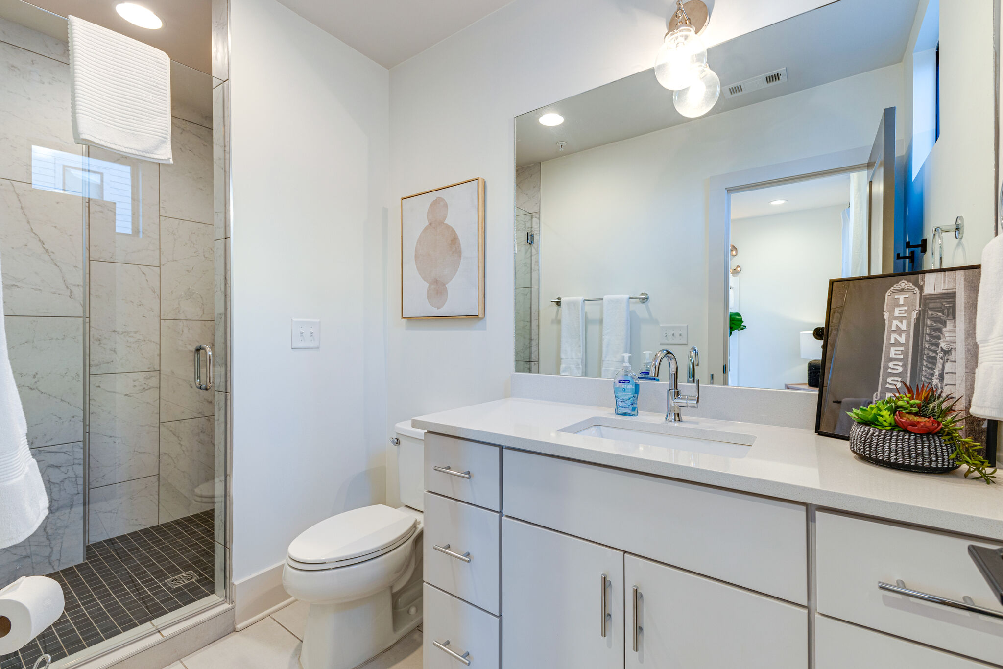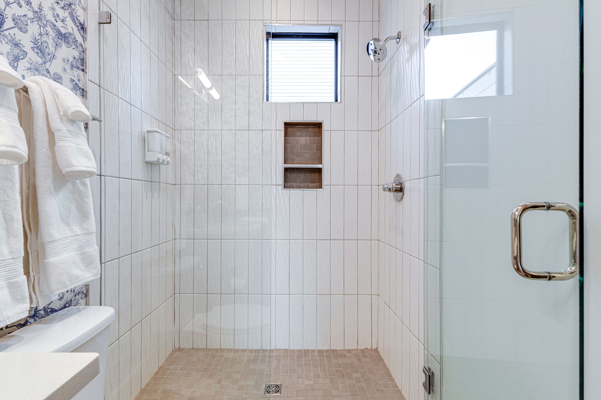 Privacy, please! The home contains five full bathrooms. Each bedroom has an associated bathroom and an additional bathroom on the fourth floor. Every bathroom features modern fixtures and custom tiles in the showers. Bathroom amenities include hair dryers and towels, shampoo, conditioner, and body wash.
